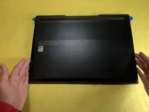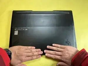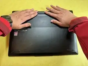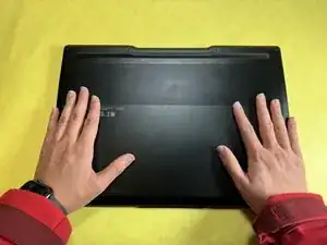 Положите ноутбук нижней крышкой вниз на ровную поверхность в чистой среде.