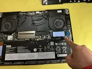 Снимите теплопроводящую прокладку, лежащую сверху SSD справа, и отложите её в сторону.