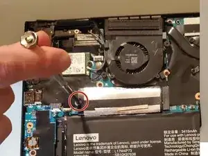 Удалите винт Phillips #00 длиной 2,8 мм, который фиксирует SSD.