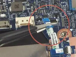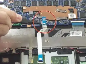 Используйте пинцет, чтобы отключить со стороны материнской платы ленту тачпада. Аккуратно поднимите чёрный язычок — лента выйдет из ZIF-разъёма.