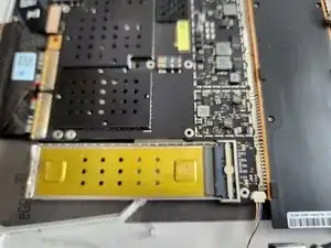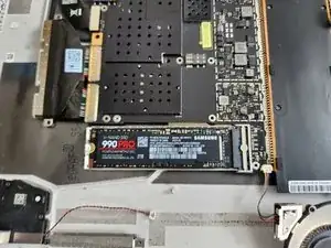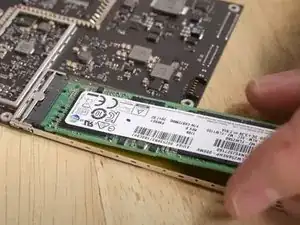 Осторожно приподнимите старый SSD. Обратите внимание, что он может быть зафиксирован двусторонней клейкой лентой, поэтому допустимо приложить некоторую силу