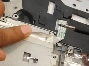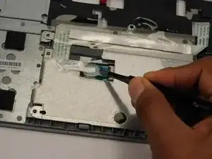 Отклейте ленту-фиксатор, удерживающую тачпад, и снимите три винта Phillips #0, фиксирующие тачпад.