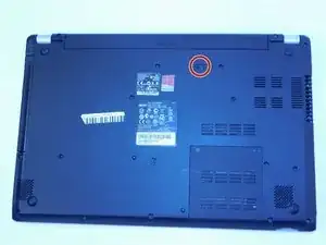 Закройте ноутбук и переверните его. Найдите фиксатор сдвига батареи. В этом руководстве место отмечено красным кружком.