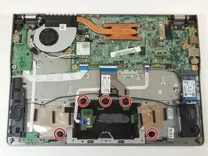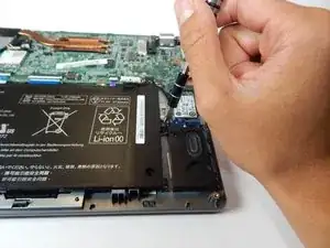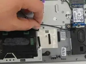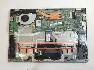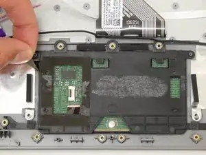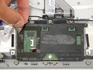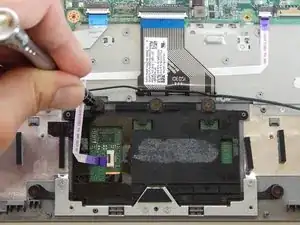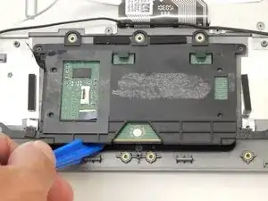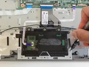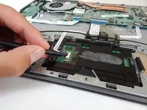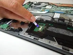 Используйте лопаточку, чтобы приподнять черную защелку на маленьком фиолетовом разъеме ленточного кабеля слева от тачпада.