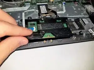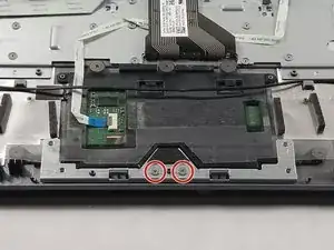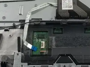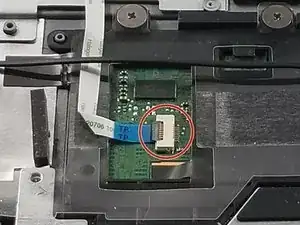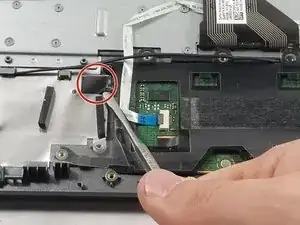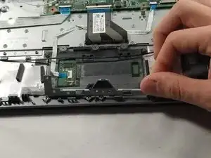 Снимите чёрный провод, проходящий через тачпад, с двух крючков в верхней части детали.