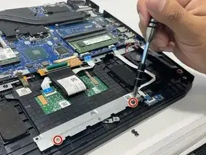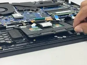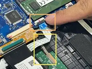 Отсоедините разъём тачпада, подняв зажим и потянув за синюю язычок.