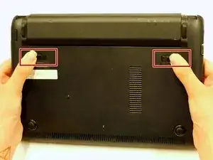 Удерживайте ноутбук двумя руками, повернув его батареей вверх.