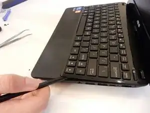 Используйте лопатку, чтобы аккуратно поддеть клавиатуру по всем сторонам, пока она не отсоединится от ноутбука.
