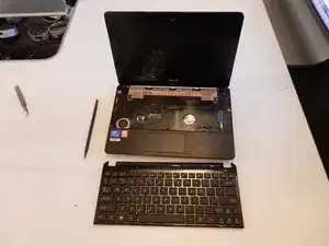 После отсоединения клавиатуры от ноутбука лента-соединитель остаётся подключённой к материнской плате. Перейдите к следующему шагу перед полным снятием клавиатуры.