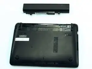 Сдвиньте батарею вверх и извлеките её из ноутбука, как показано на изображении.