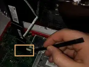 Отключите узкий ленточный кабель, подняв защёлку и выдвинув кабель из разъёма материнской платы в направлении батареи с помощью пластиковой лопатки.