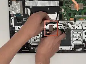 Поднимите чёрную фиксирующую защёлку, которая удерживает ленточный кабель на тачпаде.
