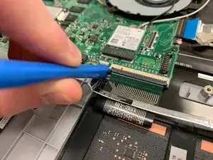Используйте маленький пластиковый инструмент для разъёма, чтобы отсоединить ZIF-разъём с левой стороны тачпада.
