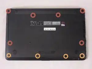 Удалите десять винтов Philips #0 на нижней части ноутбука:
