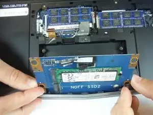 Удалите (2) винта с крестообразной шлицем 3 мм, используя отвёртку Phillips #0, которые крепят сборку твердотельного накопителя к основанию компьютера.