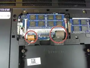Найдите два кабеля, обозначенные как "KB Backlight" (оранжевый) и "KB Membrane" (чёрный). Поднимите защёлки и отключите кабели от системной платы.