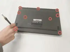Для начала замены тачпада отвинтите 9 винтов с головкой Phillips, крепящих заднюю крышку (рекомендуется использовать биту PH1 для отвертки).