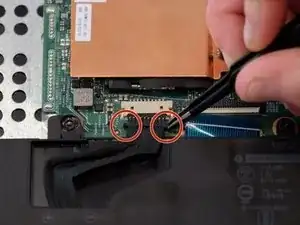 Используя пинцет с тупыми концами, аккуратно откиньте чёрную защёлку, фиксирующую кабель платы, как показано на изображении.