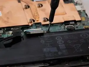 Используя пинцет с тупыми концами, осторожно отсоедините кабель батареи от платы, потянув за маленькие пластиковые защёлки по бокам разъёма.