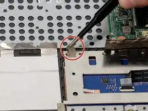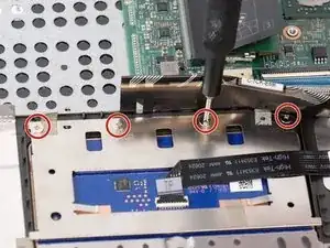 Поднимите кабель, покрывающий верхнюю часть тачпада, и снимите четыре винта длиной 2 мм, расположенные по верхнему краю, используя крестовую отвёртку #00.
