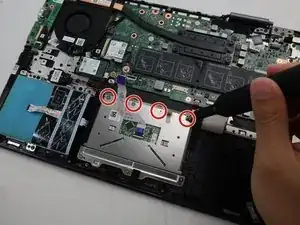 Отверткой Phillips #0 снимите четыре винта, фиксирующие тачпад к клавиатурному блоку.