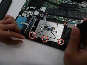 Отверткой Phillips #0 снимите три винта, фиксирующие кронштейн тачпада к клавиатурному блоку.