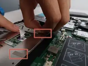Снимите ленту, фиксирующую кабель аккумулятора к разъёму кабеля аккумулятора.