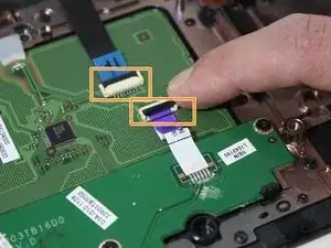 Поднимите черные защёлки над двумя кабелями, показанными на фото, и вытяните кабели.