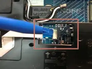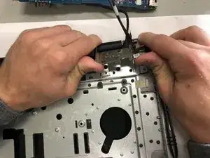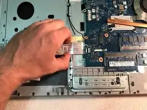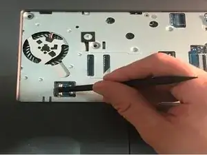 Используйте пластиковый инструмент для вскрытия или ноготь, чтобы отжать язычок разъёма кабеля. Затем вы сможете отсоединить кабель.