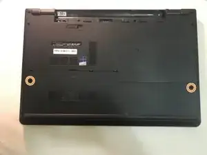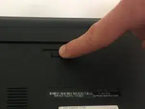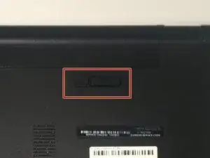 Переверните ноутбук так, чтобы серийный номер был сверху. Вы должны увидеть фиксатор батареи.