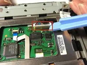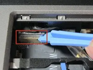 Используя пластиковый медиатор, отожмите синюю защёлку, фиксирующую кабель клавиатуры.