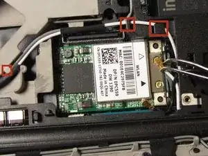 Снимите чёрный и белый кабели с беспроводной карты пинцетом, потянув вверх.
