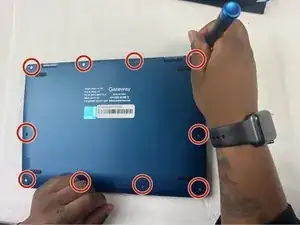 Удалите десять винтов 3.0 мм с головкой Phillips #00 с задней панели ноутбука.