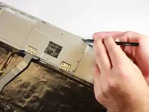 Используйте нейлоновую лопатку, чтобы выдавить тачпад из корпуса, вставив остриё в отверстие рядом с краем корпуса.