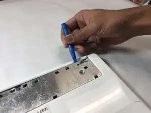 Переверните Chromebook и, начиная с верхнего правого или левого угла большого синего элемента, используйте пластиковый инструмент для открытия, чтобы удалить его.