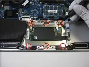 Используйте крестовую отвертку Phillips #00, чтобы отвинтить шесть винтов 2 мм, крепящих тачпад.
