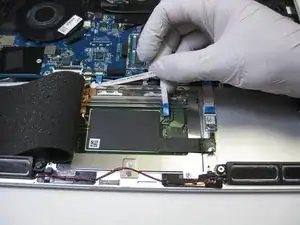 Аккуратно отключите белый шлейф, присоединённый к нижней стороне тачпада.
