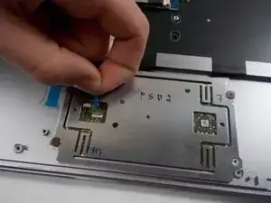 Тачпад подключен к материнской плате с помощью небольшого шлейфа. Поднимите черную защелку на соединителе ZIF и аккуратно вытяните шлейф.