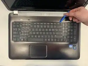 Используйте пластиковый инструмент для вскрытия, чтобы ослабить и снять клавиатуру. Начинайте с верхней средней части клавиатуры и двигайтесь по краям.