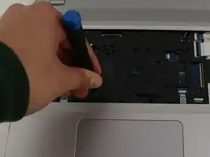 С помощью лопатки нажмите на две чёрные защёлки, которые находятся под местом, где ранее был жёсткий диск.
