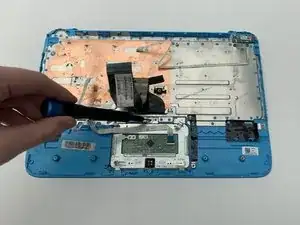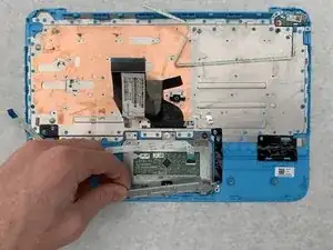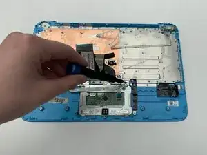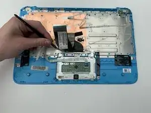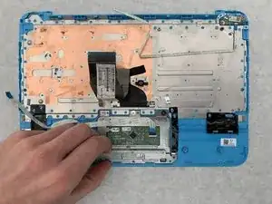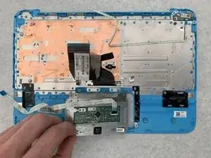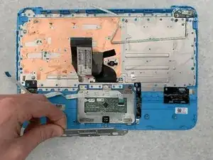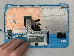 Снимите тачпад, аккуратно потянув вверх за металлическую деталь в нижнем левом углу тачпада.