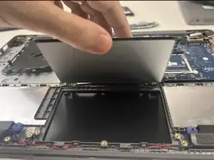 Поднимите крышку тачпада и удалите тачпад из ноутбука.