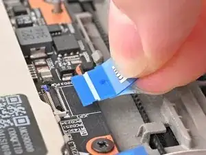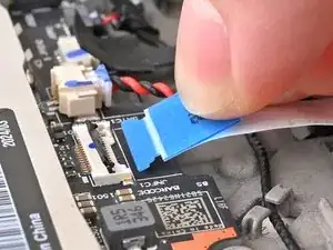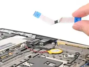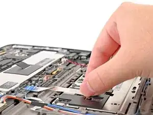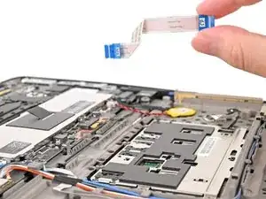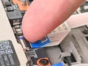 Используйте ноготь или плоский конец лопатки, чтобы откинуть фиксирующую планку на ZIF‑разъёме кабеля тачпада.