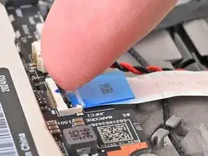 Используйте ноготь или плоский конец лопатки, чтобы откинуть фиксирующую планку на ZIF‑разъёме кабеля тачпада (обозначен «JCP1»).