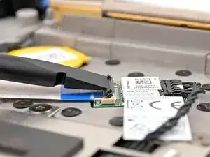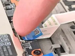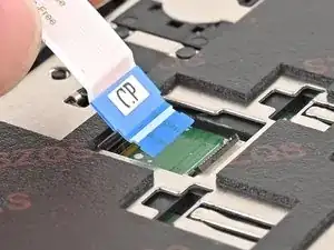 Используйте ноготь или плоский конец лопатки, чтобы откинуть фиксирующую планку на ZIF‑разъёме шлейфа NFC.
