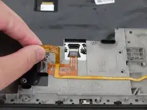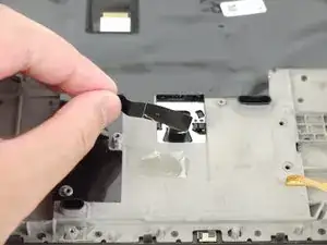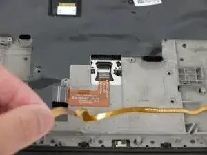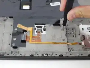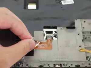 Тем же пластиковым инструментом поднимите фиксатор и отключите кабель трекпада от материнской платы.