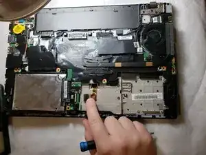 Отключите кабель, изображённый слева на этом фото, который соединяет материнскую плату с жёстким диском.