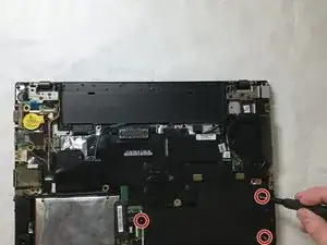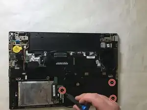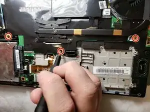 Используя крестовую отвёртку #0, открутите два винта длиной 5 мм, крепящих тачпад к компьютеру.