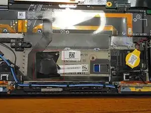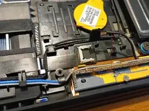 Протяните теперь свободный шлейф данных под двумя антенной кабелями к левую сторону тачпада.