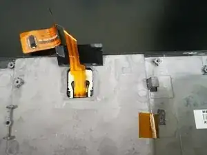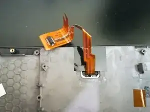 Затем поднимите два разъёма, один находится под только что снятым большим разъёмом. Их нужно отсоединять, поднимая чёрную защёлку разъёма в вертикальное положение, затем аккуратно вытаскивая ленточный кабель. На фото они отмечены оранжевым.